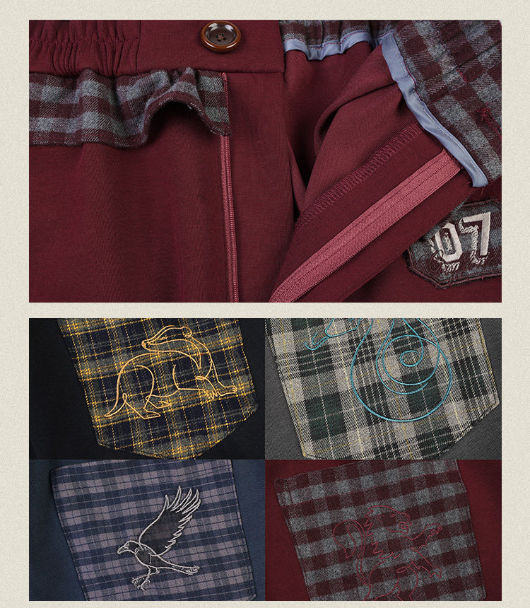| color | Slytherin top, Ravenclaw top, Hufflepuff top, Gryffindor top, Slytherin pants, Ravenclaw pants, Hufflepuff Pants, Gryffindor Pants |